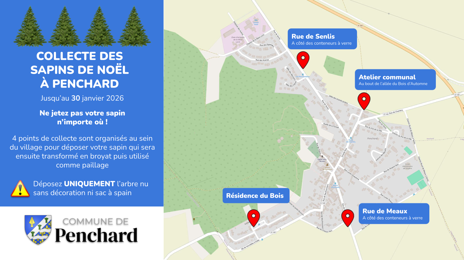 Collecte des sapins de Noël Jusqu'au 30 janvier 2026, des points de collecte de sapins de Noël sont disponibles aux 4 coins du village : Rue de Senlis auprès du conteneur à verre Rue de Meaux auprès du conteneur à verre Résidence du Bois Allée du Bois d'Automne au niveau de l'atelier communal Veuillez vous assurer que votre sapin est totalement dépourvu de neige artificielle, décoration, sac à sapin et socle.
