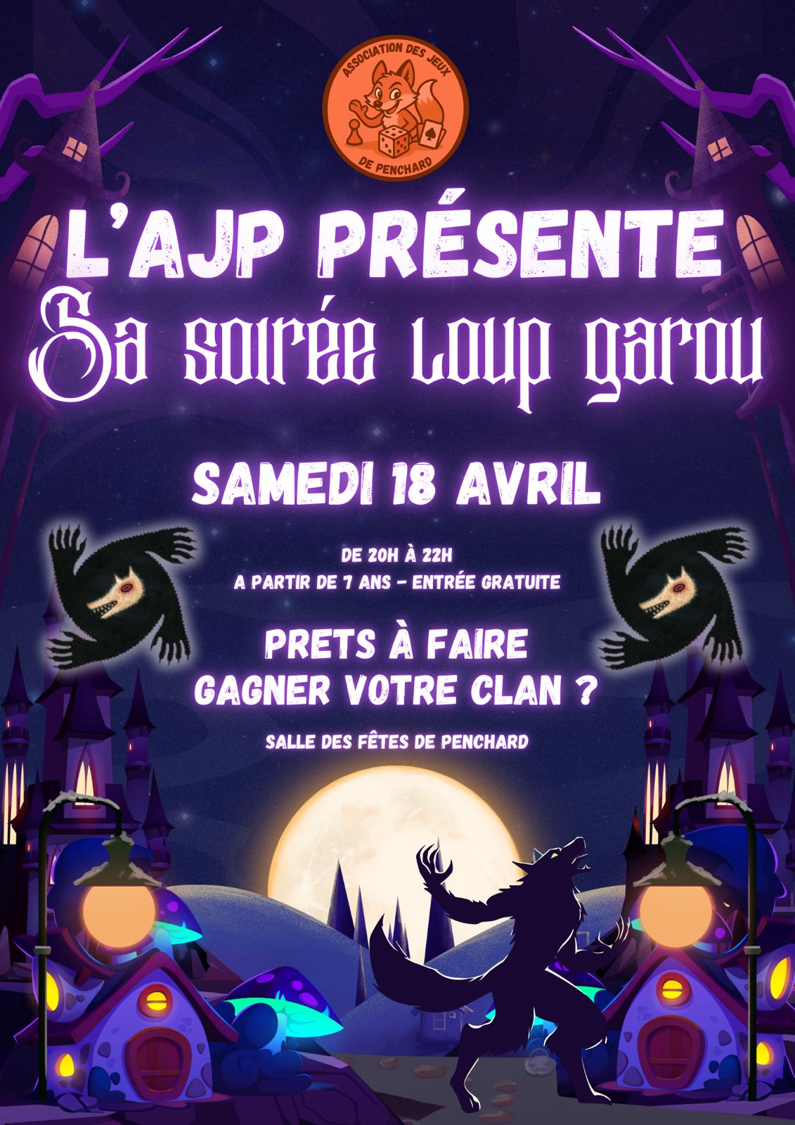 L'Association des Jeux de Penchard vous propose sa soirée Loup garou le samedi 18 avril de 20h à 22h à la salle des fêtes de Penchard !