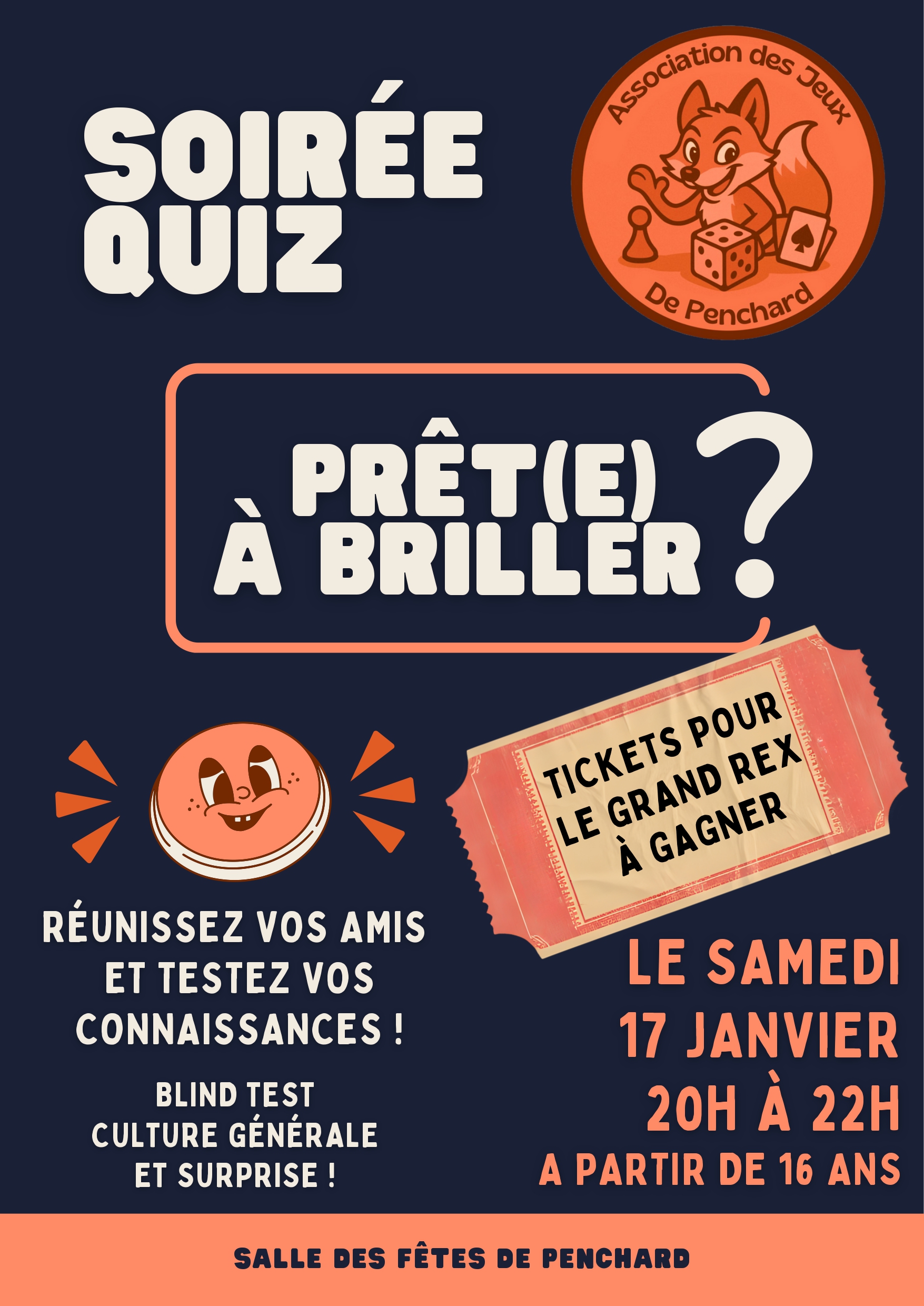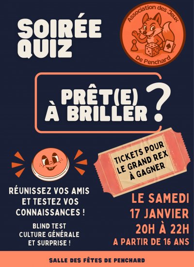 L'Association des Jeux de Penchard organise une grande soirée quiz, à partir de 16 ans, le samedi 17 janvier de 20h à 22h dans la salle des fêtes de Penhcard.
